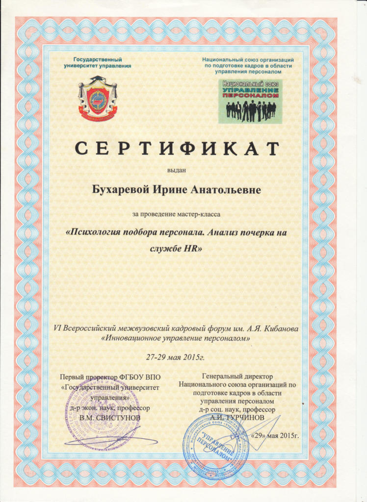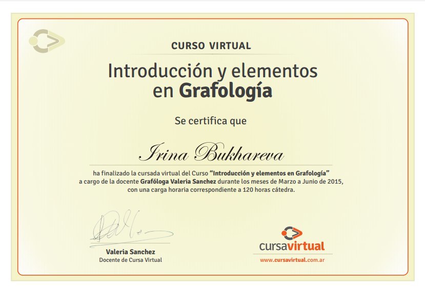 «Введение и элементы в Графологии». Сертификат удостоверяет, что Ирина Бухарева закончила виртуальный курс «Введение и элементы в Графологии», проведенный доцентом-графологом Валерией Санчес с марта по июнь 2015 г., соответствующий 120 ч