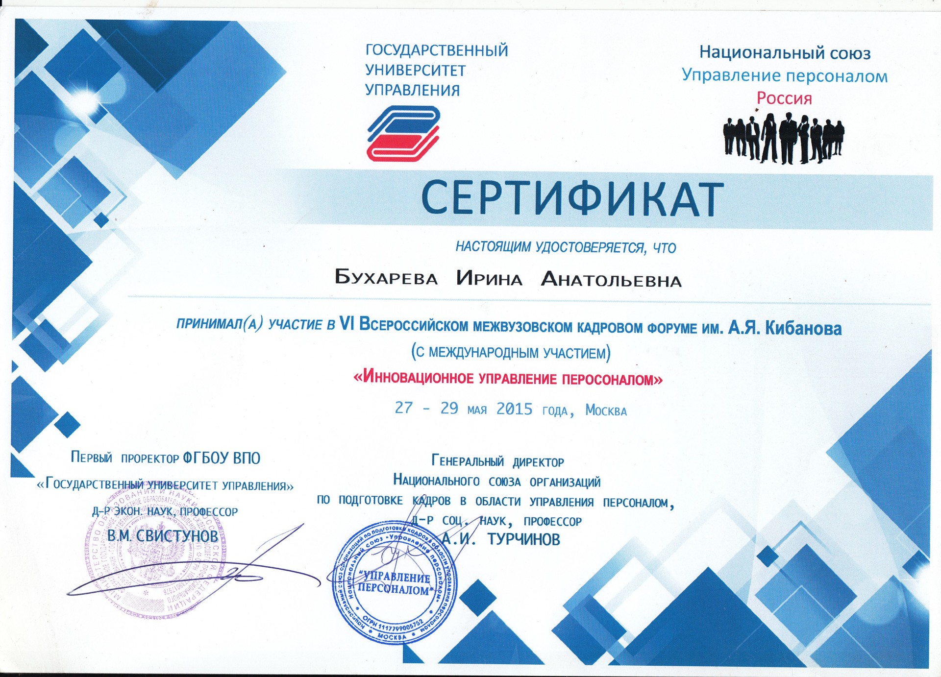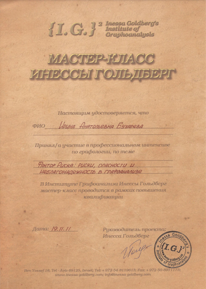 «Графология, почерк и личность». Сертификат удостоверяет, что Ирина Бухарева закончила виртуальный курс «Графология, почерк и личность», проведенный доцентом-графологом Валерией Санчес с февраля по март 2016 г., соответствующий 40 ч