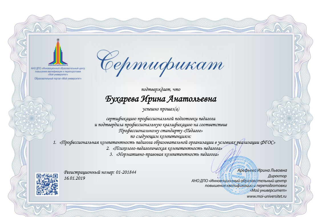 Сертификат квалификации и профессиональной подготовки педагога в соответствии Профессионального стандарта "Педагог" по следующим направлениям:
